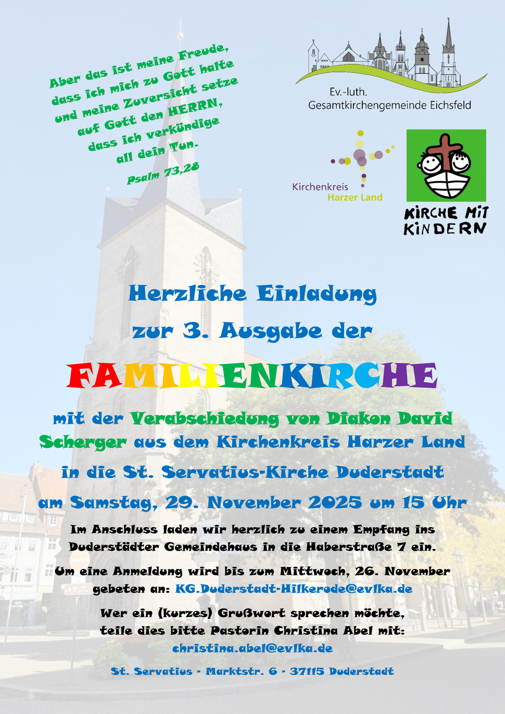 Diakon David Scherger wird zum Ende dieses Jahres den Kirchenkreis Harzer Land verlassen und in Northeim eine neue Wirkungsstätte finden. Aus diesem Grund wird er im Rahmen der Familienkirche